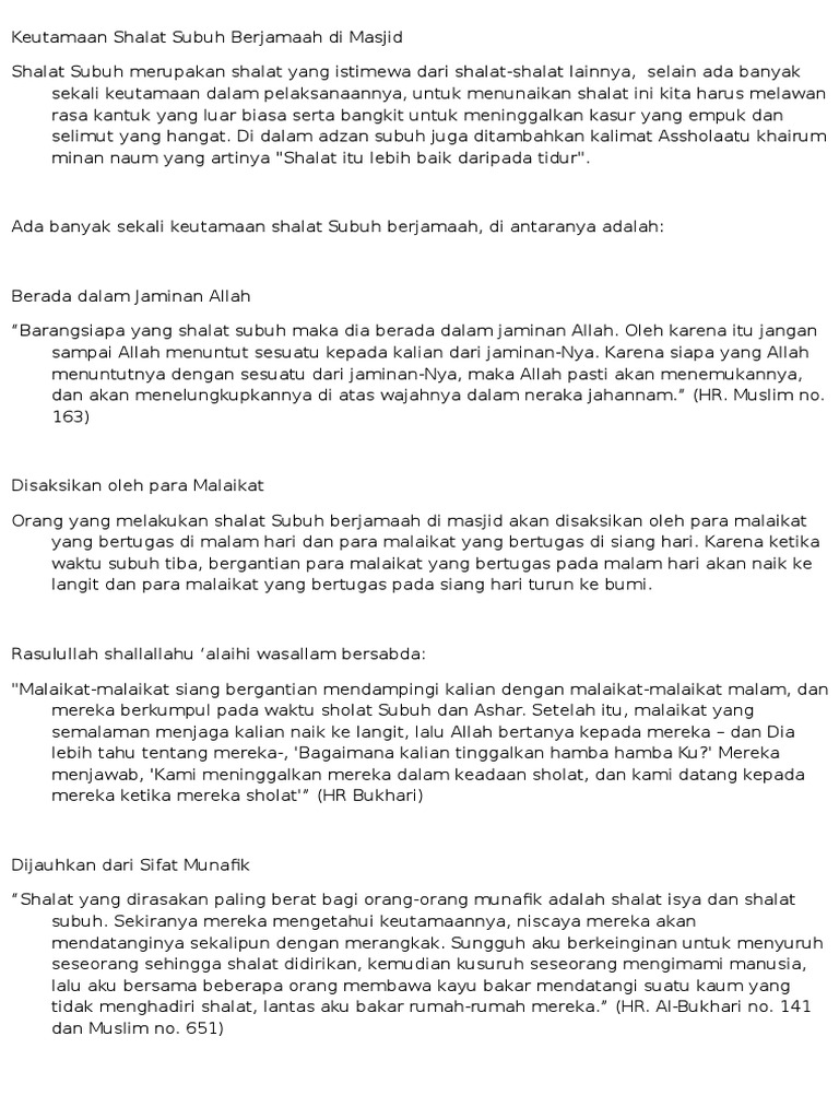 Rahasia dan keutamaan shalat subuh pembahasan tentang shalat subuh didalam ajaran islam adalah termasuk kedalam shalat wajib lima waktu yang wajib dan harus dilakukan dan dikerjakan oleh tiap tiap umat muslim diseluruh dunia karena tidak bisa dipungkiri bahwa setiap umat muslim telah diwajibkan untuk selalu mengerjakan shalat wajib lima waktu disetiap harinya dan shalat wajib lima waktu. 657 dan muslim no. Sekiranya mereka mengetahui keutamaan keduanya niscaya mereka akan mendatanginya sekalipun dengan merangkak hr.